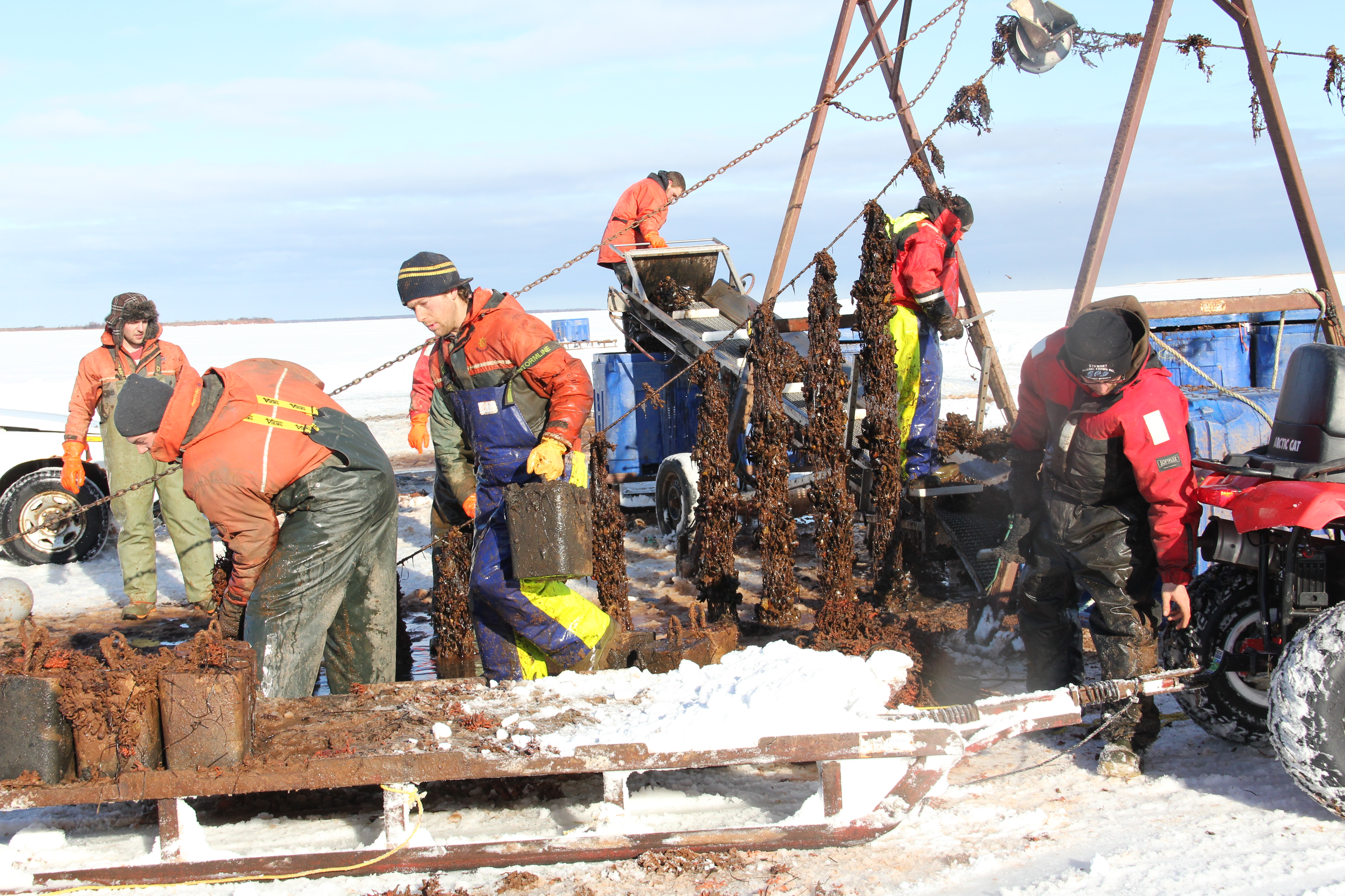 This video shows what the winter mussel harvest looks like in Prince Edward Island: https://www.youtube.com/watch?v=xy4BR1nye0c